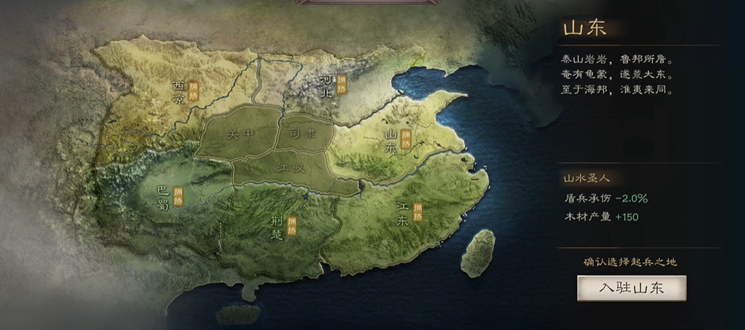 选择山东作为出生地的小伙伴们会获得独特的属性加成,主要是盾兵承伤减少2%和木材产量增加150。这种加成让山东成为前期发展内政的绝佳选择,尤其是喜欢稳扎稳打的玩家。盾兵减伤效果能有效降低战损,而木材作为基础资源之一,能帮助更快升级建筑和训练部