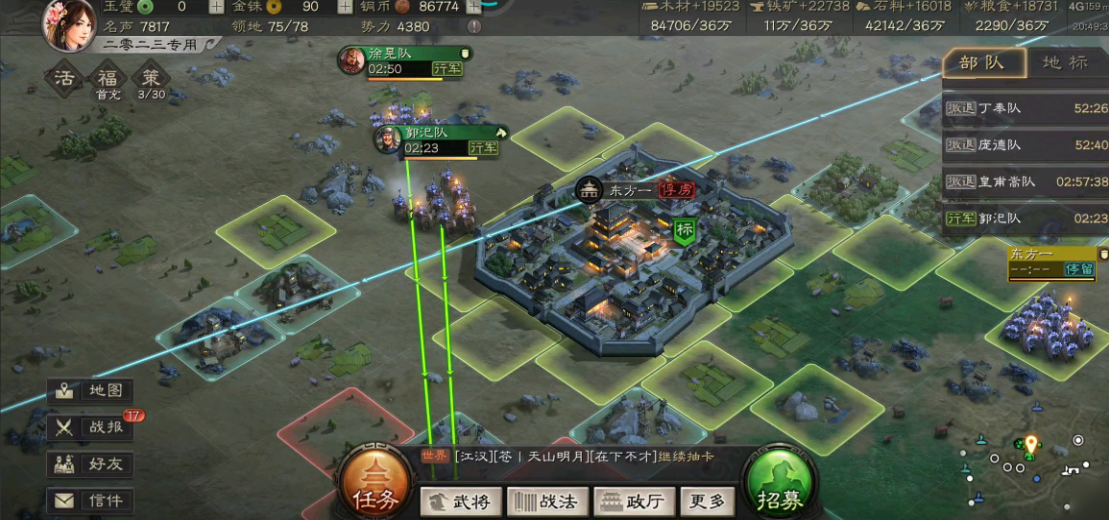 攻击其他部队,首先得确保自己的主力队伍足够强大。点击敌方城池选择攻占,然后派出主力部队。主力部队的任务是消灭对方的主力,等对方主力被击败后,再选择行军路线让器械兵跟上。器械兵的作用是攻城,但要注意城墙和内墙的防御机制,必须先攻破外墙才能攻击