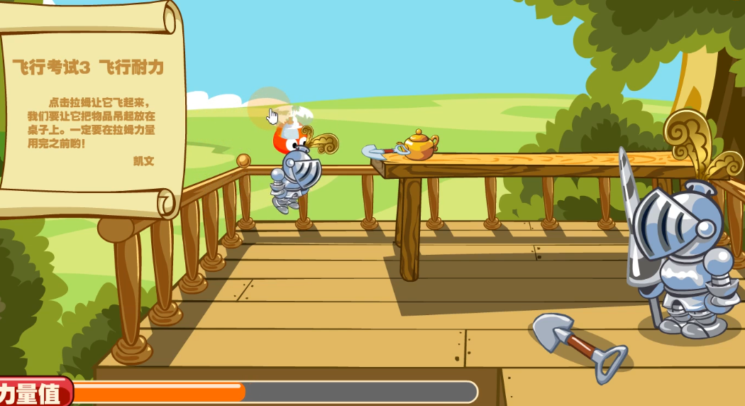 飞行考试第三关是拉姆耐力测试的核心环节,需要将三件物品依次运送到指定桌面。关键在于精准控制拉姆的飞行轨迹与体力分配。操作时需持续点击拉姆的叶片使其保持上升,点击下方区域可减缓速度但会消耗更多体力。第一件小水壶重量较轻,建议先将其运至桌面左侧
