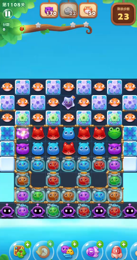 1108关的核心目标是在23步内消除250个猫头鹰、22个萌豆和100个气鼓鱼,步数限制较为紧张,因此需要高效利用每一步。这一关的难点在于消除的目标数量很大,并且存在锁链和毛毛球等障碍物,增加了通关的挑战性。玩家需要制定清晰的策略,优先处理