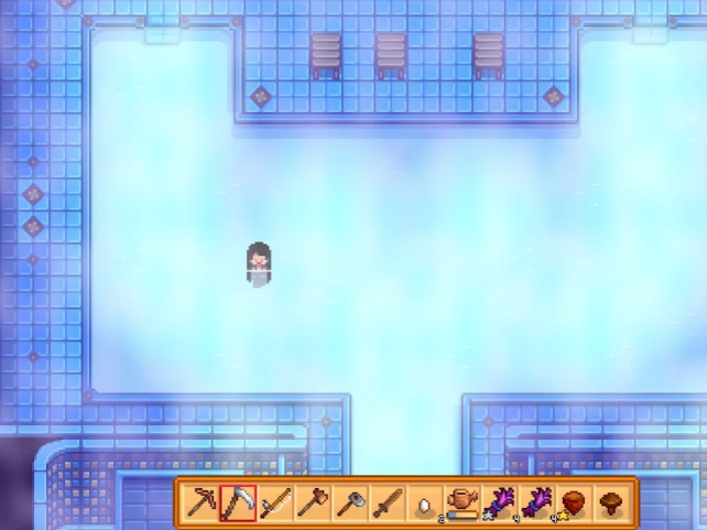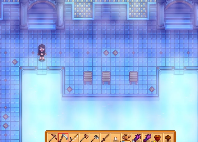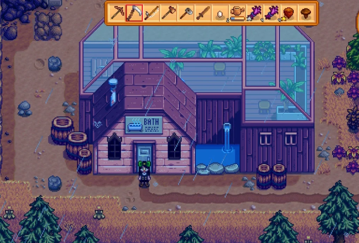 洗澡主要通过两种方式实现,玩家角色泡澡恢复体力与照顾孩子洗澡的互动机制。澡堂位于火车站附近,需在第一年夏季第三天发生地震后解锁道路才能进入。泡澡可快速回复全部体力和生命值,是矿洞探索或高强度劳作后的高效补给方式。浴室分男女区域,玩家无法进入异性浴室,强行闯入会触发特殊对话但无实际惩罚。冬季澡堂水池结冰无法使用,春夏秋三季均可正常泡澡。