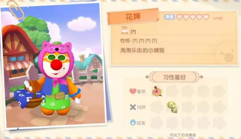 她通常在淘淘乐街活动,是一个戴着帽子、墨镜,提着盒子的神秘商人。虽然打扮有点古怪,但她人很好,会热情介绍商品。每天可以给她送10次礼物,记得优先选择她喜欢的物品,避免送她讨厌的东西,比如甲鱼,否则会降低好感度。