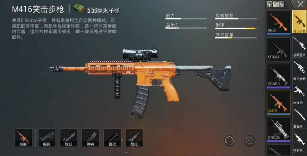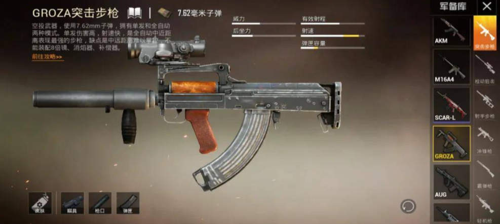 突击步枪中M416满配后稳定性最佳,适合中远距离全自动扫射,但依赖枪托、握把等配件。Groza作为空投武器,伤害和射速兼具,但后坐力较大。AKM单发伤害高,全自动模式下需较强压枪技巧。SCAR-L后坐力线性且易于控制,但射速稍慢。这类武器需根据战局选择开火模式,例如远距离切换单点以提高精度。