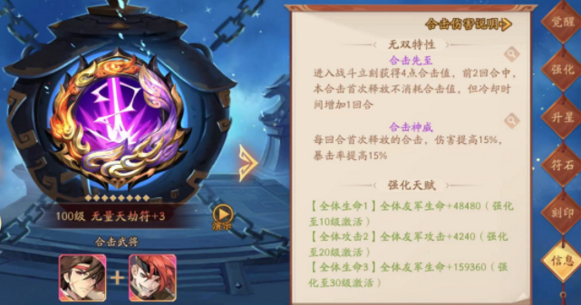 单核输出阵容中,主力武将应佩戴乾坤符或轮回符,副将搭配不灭符提升生存能力。多核阵容则需均衡分配,例如前排武将携带无极符控制敌方,后排输出位使用五星金神符强化暴击。金兵符的觉醒等级直接影响技能效果,建议优先将主力武将的兵符升至三星以上,以激活关键减益或增伤特性。
