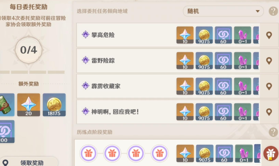 委托板块是每日必做的内容,每天会刷新四个任务,完成后能获得原石和摩拉等奖励。记得做完四个委托后,一定要去冒险家协会找凯瑟琳领取额外奖励。秘境板块则汇总了所有已解锁的副本,包括圣遗物、天赋材料和武器突破本,可以直接传送到对应地点。讨伐板块能快速定位精英敌人,方便咱们刷取角色突破材料。