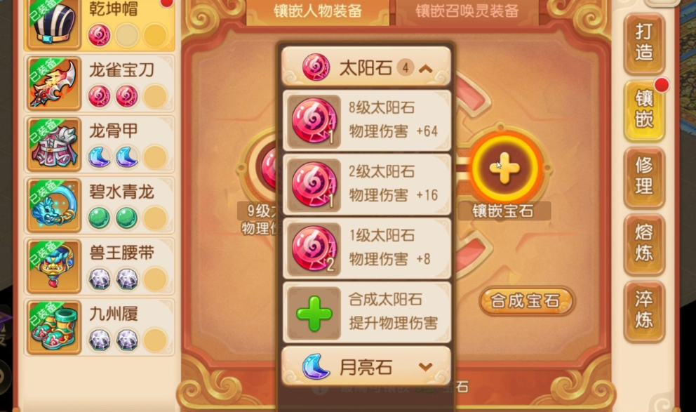 装备选择上应以提升物理伤害和暴击属性为主,武器和头盔推荐镶嵌太阳石增加攻击力,项链选择带有破血狂攻特技的装备以弥补机动性不足。鞋子需优先考虑速度属性,确保在战斗中能先手出手。腰带可根据需求选择黑宝石或光芒石,前者提升速度后者增加生存能力。法宝方面推荐携带金甲仙衣、飞剑和战鼓,太阴属性的金甲仙衣能有效提升生存能力,而飞剑则进一步增强输出。