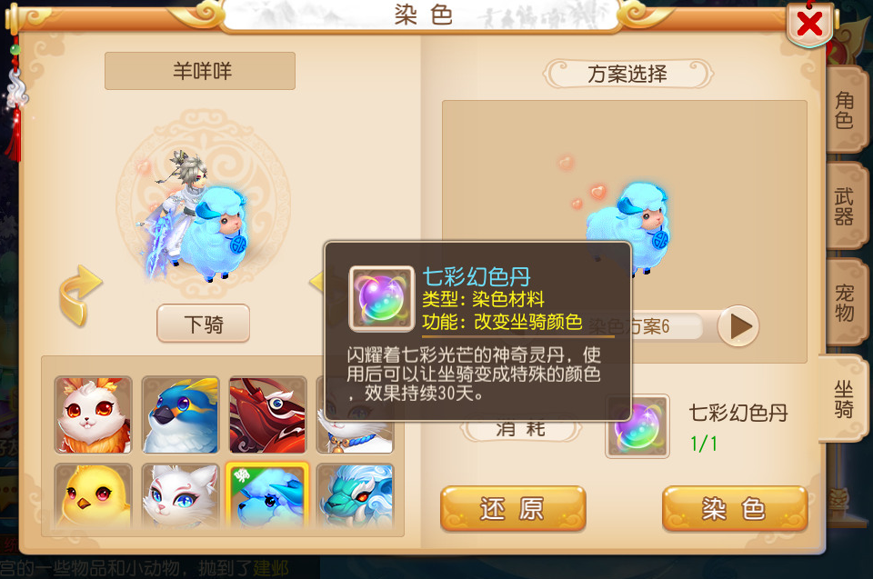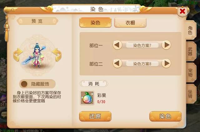 玩家可以通过染色改变角色、装备、召唤兽和坐骑的外观颜色。染色不仅能提升视觉效果,还能展现玩家的独特风格。染色需要消耗特定道具,如花豆、彩果、幻色丹或虹石,这些材料可通过游戏内活动、商城购买或任务奖励获取。染色功能覆盖角色服饰、武器、宠物等多个方面,每种染色方案均有不同的材料消耗和操作流程。