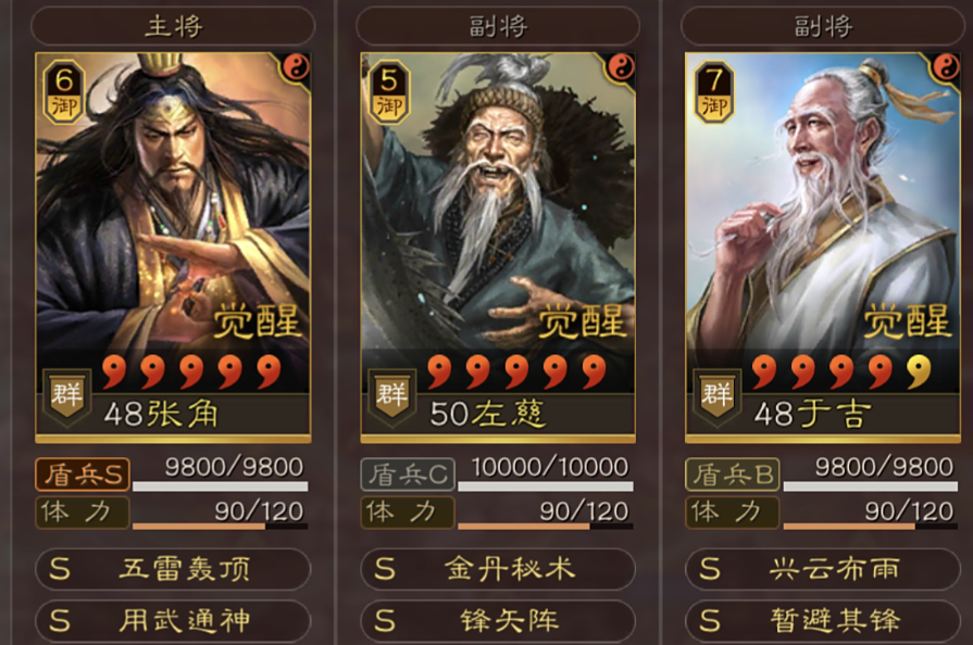选择能提供稳定解控、治疗和属性加成的武将与张角搭配是防御基础。由张角、于吉和左慈组成的三仙队能激活乱世妖星缘分,获得全队智力速度提升和主将攻心效果,左慈的规避和于吉的水攻状态在辅助输出的同时增强了队伍生存。更进阶的搭配是组成鸿蒙盾,例如张角携带太平道法和士别三日作为核心输出,由鲁肃携带暂避其锋和锋矢阵提供减伤与属性转移,再搭配兀突骨或曹操此类高统率武将携带草船借箭和藤甲兵,草船借箭能提供强力的群体解控与治疗,而藤甲兵则能高效抵御兵刃伤害,这种组合通过暂避其锋、锋矢阵、藤甲兵以及鲁肃自带战法的多层减伤,为张角创造了站满八回合持续输出的稳定环境。
