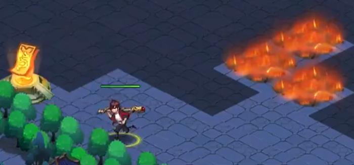 进入副本后,开局会在地图起点附近看到一个黑衣人,上前与他对话触发剧情,之后他身后的宝箱就可以开启了。拿完这个宝箱后向右走,会遇到游荡的亡灵挡住去路,必须通过战斗将其消灭才能继续前进。沿途在拐角等处可以开启第二个宝箱,接着你会遇到夏侯渊,再次通过对话推进剧情。地图中存在火焰陷阱区域,你需要找到并触发场景中的金色符篆机关来熄灭火焰,才能打通道路,特别是在左上角区域,需要触发机关才能解除障碍。