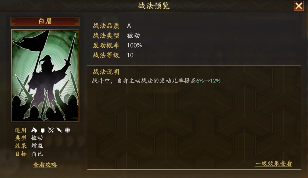 关羽其自带战法威震华夏的特性,该战法集高额全体兵刃伤害与缴械、计穷双重控制于一身,是游戏中最顶级的群体控制兼输出战法之一。其35%的发动概率与需要一回合准备的特性,是其发挥稳定性的主要制约。一切配将思路都需服务于解决这两个痛点:一是提升战法