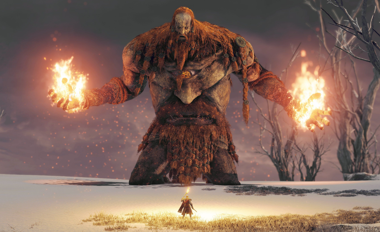 火焰巨人的战斗区域位于雪山地图东北部的火焰之巅,需穿过结冰湖和萨米尔废墟等区域。该BOSS分为两个阶段,第一阶段以脚部踩踏和火焰投掷为主,建议骑马贴近其左脚(已腐烂的弱点部位)进行输出。第二阶段巨人会扯下左腿并释放大范围火焰技能,需注意躲避地面熔岩和翻滚攻击。推荐使用高削韧武器或远程法术,如猎犬步伐战灰可有效规避致命伤害。