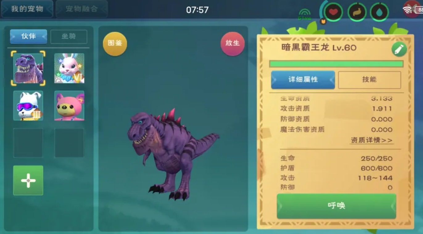 打的时候咱们得注意技巧,不能硬刚。最好边跑边射箭,保持距离,等它血量降到30%左右再用木棒敲晕。现在版本里,黑暗霸王龙不会轻易被单刷,所以建议拉上小伙伴一起,有人吸引火力,咱们就能更轻松地搞定它。抓到手后,它可是超强的战宠或者坐骑,速度能到7500左右,打架还能造成流血效果,绝对值得花时间去抓!