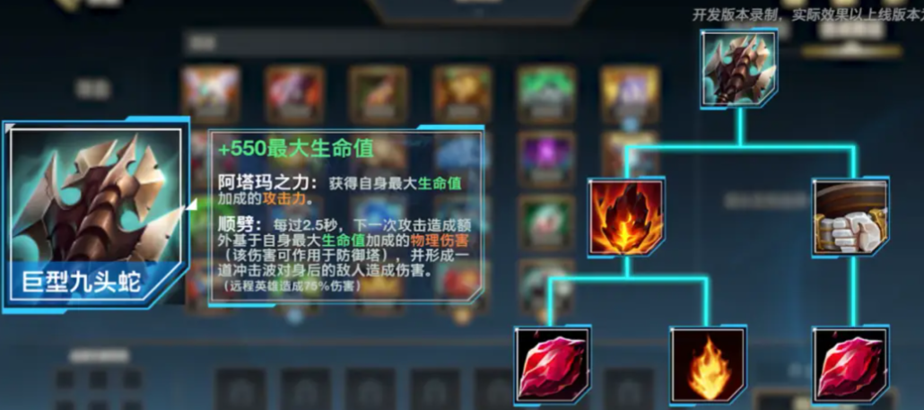 巨型九头蛇则通过牺牲部分攻击属性换取生存能力,其被动巨像提供基于额外生命值的攻击力加成,顺劈效果可造成(5+1.5%最大生命值)的物理伤害并产生冲击波。这种机制让装备者在对抗多个目标时能发挥显著优势,同时冲击波可作用于建筑物,在分推战术中表现突出。需该装备无法通过防御塔触发顺劈效果。