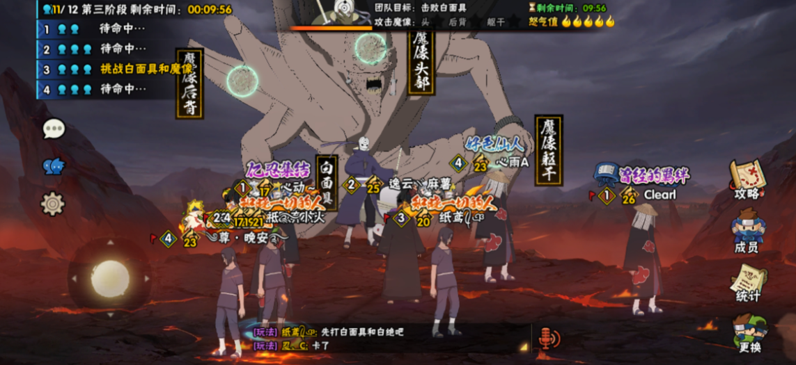 团本的第一关主要是清理白绝分身,它们会分五波出现,最后还有个融合体BOSS。这里咱们可以多用范围技能快速清场,控制型忍者也能帮上大忙。打完白绝后进入第二关,四个小队会分别对阵不同的BOSS,千万别跑错场地打别人的目标,否则会拖慢整体进度。这一关的关键是各小队同步推进,沟通好谁负责哪个BOSS,打完别急着退,等全员完成再一起进下一阶段。