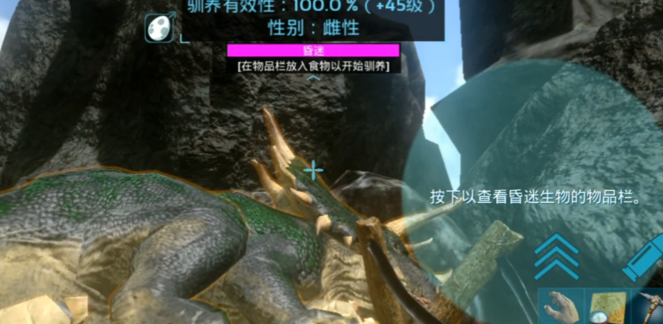 驯养阶段需要持续关注三角龙的眩晕值与饥饿度。紫色浆果是首选食物,能显著提升驯服效率;黑色浆果则用于维持眩晕值防止苏醒。若条件允许,肉牛龙蛋能大幅缩短驯服时间,但前期较难获取。整个驯服过程约需40分钟至3小时不等,具体时长取决于三角龙等级和所用食物类型。期间需保持警惕,避免其他生物攻击导致前功尽弃。