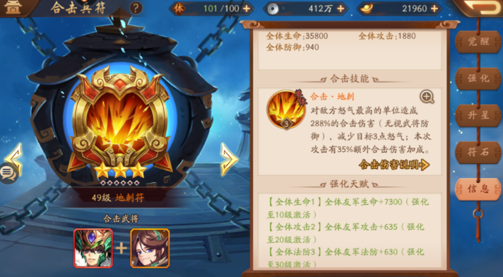 地刺符是魏国前期最实用的橙色兵符之一,其技能可对敌方怒气最高的武将造成伤害并减少怒气,有效打断对手技能释放节奏。寒冰裂符作为红色兵符,能通过十字攻击触发晕眩效果,与夏侯惇、张辽等武将的控制技能形成联动。紫金兵符惊雷裂空则能清除敌方前排增益效果,针对当前版本主流阵容的前排核心武将,如蜀国张飞、吴国太史慈等,具有显著克制作用。