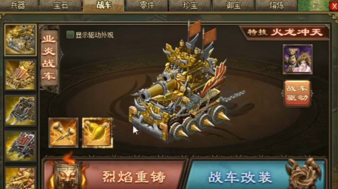 装备重铸功能位于游戏内的战车系统界面中,玩家需要先完成五辆战车的打造才能解锁该功能。进入战车界面后,可以在战车下方找到烈焰重铸和战车改装两个按钮,点击烈焰重铸即可进入重铸界面。开启重铸后,战车将获得额外的挂饰窗口,同时重铸等级提升会逐步开放武器、车身、底盘等零件位,最终可装配12个零件。