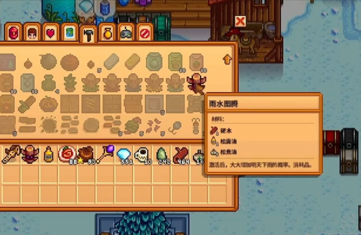 制作雨水图腾需要三种材料:1个硬木、1个松露油和5个松焦油。硬木可以通过砍伐秘密森林里的木桩获得,每天都会刷新。松露油需要先把松露放进榨油机加工,松露可以通过养猪获得,猪会在农场里自动寻找松露。松焦油则需要把树液采集器挂在松树上,等待一段时间就能收集到。