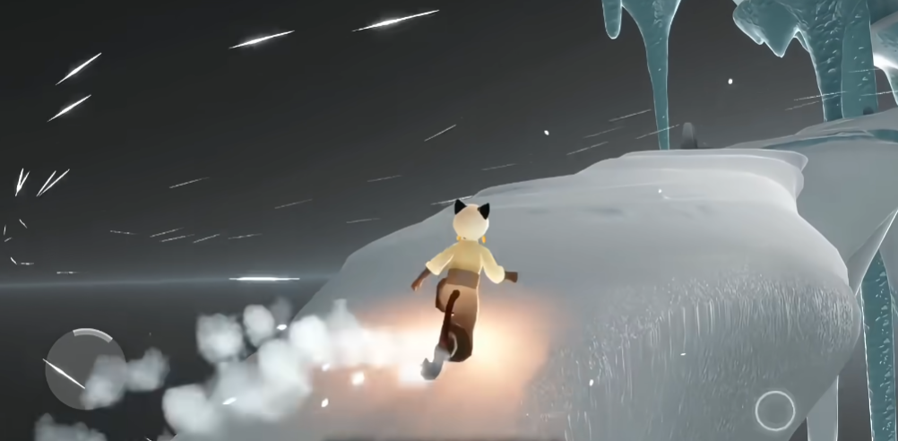 当你经历了前面的浮动踏板和几次气流升降后,会来到一个比较高的平台,这里可以算是一个中转站。从高台上往左前方仔细看,下面会有一个带着白色小蜡烛的小石台,想办法跳过去。点燃那根白色小蜡烛后,一个可以移动的浮台会被召唤过来,载着你前往一个更大的浮台。站上大浮台,别忘了点亮那里的记忆石碑,之后又会有新的移动浮台来接你,把你送到一个正前方的平台上。这个平台上聚集了很多小蜡烛,把它们全部点燃,就会再次触发强大的风力,这次风力会把你直接送上通往最终区域的路径。最后这段路有时候需要你沿着狭窄的墙壁边缘慢慢移动,风会从侧边吹来,一定要沉住气,按住方向键维持平衡,一步一步挪过去。