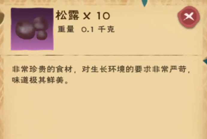 松露可是个硬通货,说它是珍稀材料一点也不过分。这东西平时在地图上晃悠可不容易发现,颜色长得跟普通蘑菇有点像,要是不仔细看还真容易错过。它的主要价值体现在制作高级宠物的饲料上,尤其是那个看起来威风凛凛的霸王龙,你想把它收为自己的战宠,松露就是必不可少的核心材料之一。这玩意儿产出量非常有限,不是随便跑个图就能捡到一大堆的,所以后期在市场上价格一直很坚挺,很多玩家都乐意花金币收购。