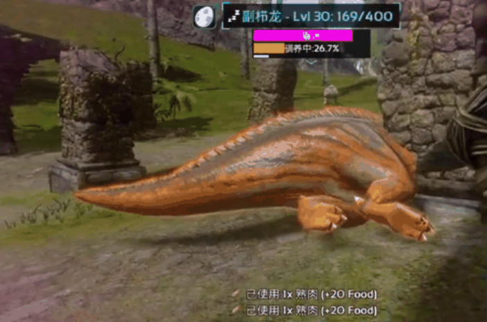 具体的驯服过程可以分为击晕和喂食两个阶段。由于副栉龙移动速度极快且遇袭就逃,单人驯服时最好利用地形(如岩石缝隙或狭窄处)进行围堵,或者使用流星锤限制其行动。使用麻醉箭或弹弓时要注意控制伤害,避免意外将其击杀,并观察其血量和眩晕条的变化。成功将其击晕后,走到它面前打开物品栏,将准备好的食物放入它的背包中。接下来需要耐心等待,副栉龙会饥饿度下降自动进食,逐步增长金色的驯养条。在此期间,你必须时刻关注紫色的眩晕条,当它开始下降时,要及时在背包中使用黑色浆果或麻醉药来维持昏迷状态。