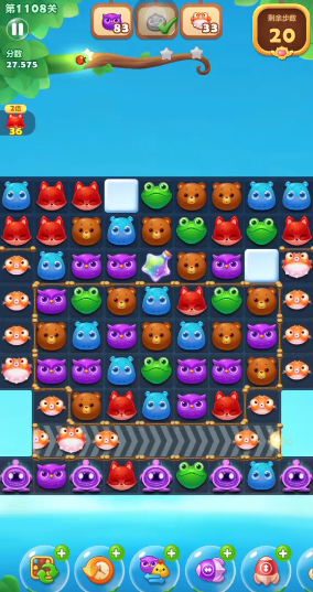 中期阶段应优先打爆气鼓鱼,即使单消也要尽快触发其爆炸效果,以清除周围障碍并让更多气鼓鱼流入中间通道。要处理两侧的冰块和底部的药罐,确保气鼓鱼能顺利流动。染色宝宝在这一关的作用相对有限,仅在上方没有其他消除选择时才考虑使用,使用时注意与场上数量最多的动物颜色交换,以最大化消除效果,避免分散精力。