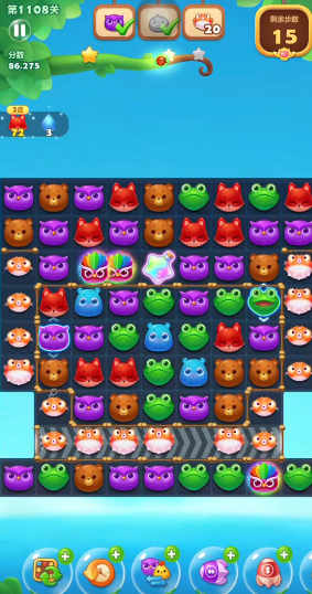 1108关的核心目标是在23步内消除250个猫头鹰、22个萌豆和100个气鼓鱼,步数限制较为紧张,因此需要高效利用每一步。这一关的难点在于消除的目标数量很大,并且存在锁链和毛毛球等障碍物,增加了通关的挑战性。玩家需要制定清晰的策略,优先处理关键元素以打开局面,避免浪费步数在次要目标上。
