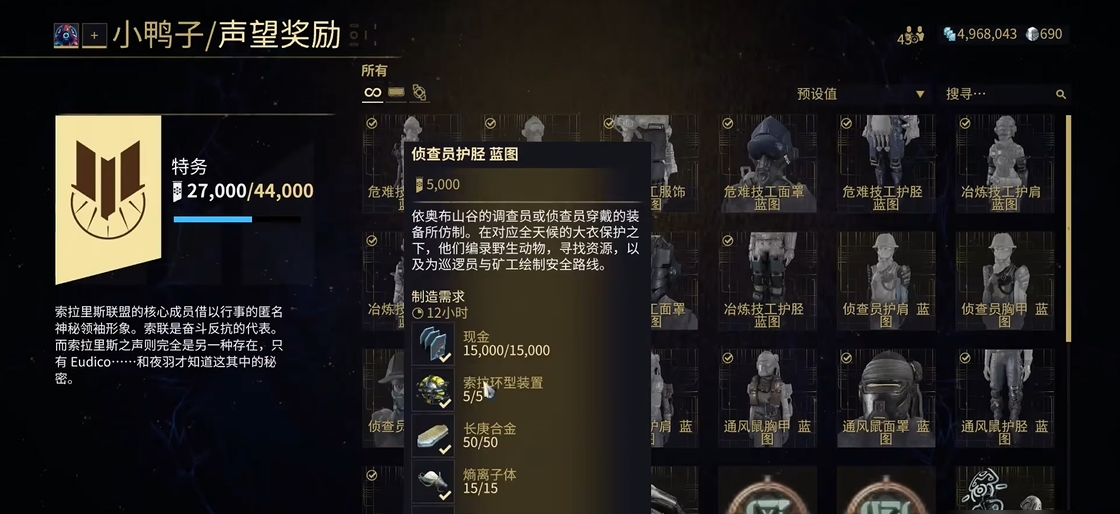 完成赏金任务后,记得返回福特纳的密室交付并领取奖励。通过任务获得的特定材料,主要是各种环形装置,可以向小鸭子捐献来提升其专属声望等级。环形装置主要分为普通环形装置、圣油环形装置和天蓝环形装置,它们分别提供不同数值的声望。这些材料可以通过完成密室赏金任务或击败金星平原上的特定敌人(型蜘蛛)获得。你的声望等级越高,能够解锁并兑换的物品就越多越高级,奖励包括稀有的增幅器部件、战甲蓝图、指挥官装饰品以及特殊赋能等。需声望的每日获取存在上限,该上限与你的账号段位相关联,因此建议优先提交高价值的材料以充分利用每日额度。