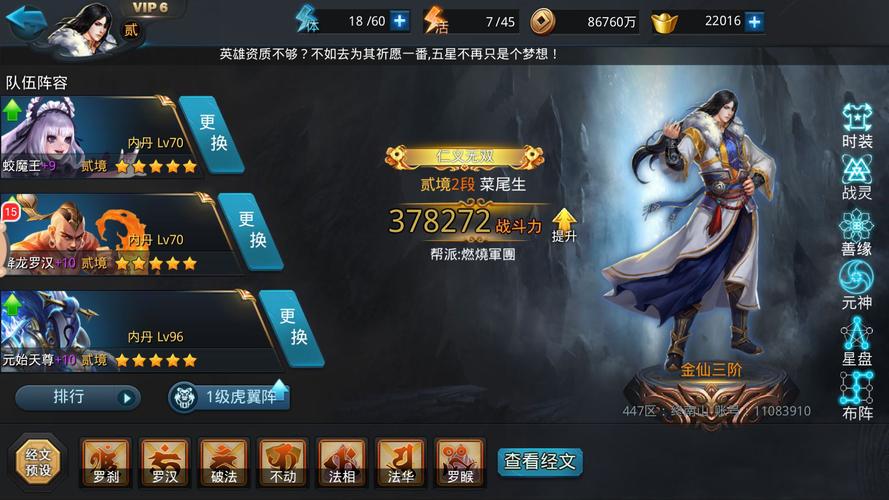 元神搭配需联动经文、法宝与英雄配置最大化收益。经文必选幻影,再搭配罗汉、罗睺、法华、罗刹、转轮增伤组合。法宝主C带玉琵琶提升召唤物伤害,辅助带混元伞保生存。英雄选孙悟空、帝释天、亢金龙等分身形,配合伏羲元神与暴击装,可全程维持多单位输出。打龙时元神技能在召唤物齐出、BOSS无减伤时释放,覆盖完整输出周期。平民资源有限时,先升顺风耳元神境界,紫色魂印过渡,攒材料合成金色魂印,逐步替换提升。
