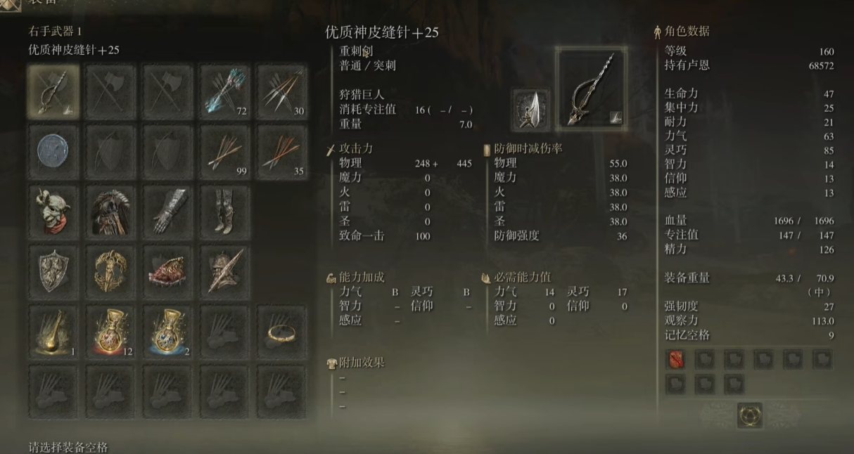拿到武器后别忘了试试手感!神皮缝针属于重刺剑,攻击速度比大剑快,但比直剑稍慢,适合喜欢灵活又带点爆发的小伙伴。它的战技贵族气场能提升攻击范围,清小怪或者PVP都很实用。如果想强化这把武器,记得多收集锻造石,毕竟+25的神皮缝针才是完全体。