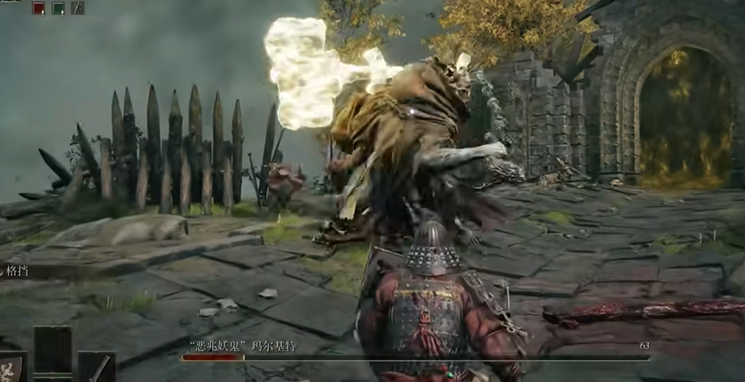 从初始赐福点引导之始出发,沿主路径穿过关卡前废墟,抵达风暴关卡城门。城门内道路两侧有大量杂兵与狼群,建议骑马快速通过。尽头处可见通城隧道赐福点,激活后继续前进即可触发玛尔基特战斗。若初次尝试难以取胜,可先探索周边区域提升等级或获取强化素材。