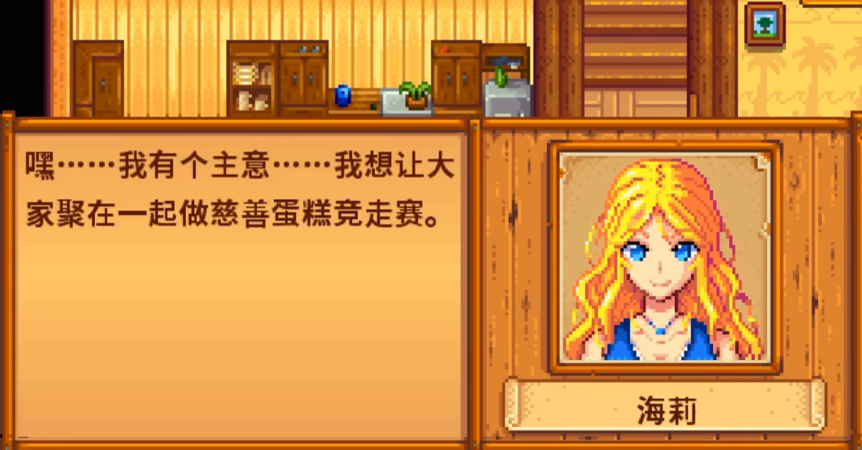 第二天回到农舍,她会提出举办慈善蛋糕秀的想法,并要求你带巧克力蛋糕参加。最后在非雨天的早上6点到下午3点之间,带着蛋糕进入鹈鹕镇广场就能完成整个事件,大部分村民都会来参加这个温馨的活动。平时多送她喜欢的礼物,比如向日葵、椰子或粉红蛋糕,避开她讨厌的蘑菇类物品。